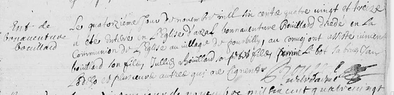 | Prénom | Bonaventure | | Nom de famille | Bouillard | | Naissance | ? | | Le quatorzieme jour de novembre mil six cent quatre vingt et trois a été enterré en l'Eglise d'Arzal, Bonnaventure Bouillard decedé en la communion de l'Eglise au village de Gourgilly, au ... on assisté Vincent Bouillard son fils, Julien Bouillard son petit fils ?, Perrine le Bot sa brue, Jan Lorho et plusieurs autres qui ne signent | Décès (plus...) | 14 novembre 1693 | Arzal, Morbihan, FRANCE (, Arzal, 56004, Morbihan, Bretagne, France) | Témoins Décès | Témoin Vincent Bouillard Témoin Julien Bouillard (12 février 1676 - 18 septembre 1732) Témoin Perrine Le Bot (? - 12 novembre 1711) Témoin Jean Lodého