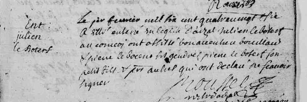 le premier février mil six cent quatre vingt et six a étté enterré en l'église d'Arzal Julien le Boterf au ... ont assisté bonaventure Bouillard et Pierre le Boceno fils , gendre pierre Le Boterf son petit fils et plusieurs autres qui ont déclaré ne savoir signer