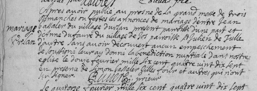Après avoir publié au prosne de la grande messe de trois dimanches on fettes les annonces de mariage de Jean Bassaler du village durlan present paroisse d'une part et d'Anne dufaure du village de Jos paroisse St Julien de Tulle d'autre part sans avoir decouvert aucun empêchement je soussigné leur ay donné la benediction nuptiale dans notre eglise le douze fevrier mille six cent quatre vingt dix sept en presence de Simon bassaler gilles four et autres qui n'ont sousigner
