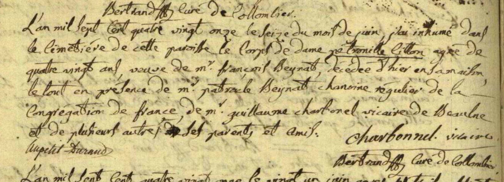 | Prénom | Pétronille | | Nom de famille | Citton | | Naissance | 1711 | Lapeyrouse-Fossat, Haute-Garonne, FRANCE (, Lapeyrouse, 31273, Haute Garonne, Occitanie, France) | l'an mil sept cent quatre vingt onze le seize du mois de juin, j'ai inhumé dans le cimetiere de cette paroisse le corps de dame Petronille Citton agée de quatre vingt ans, veuve de Mr François Beynat, décédée d'hier en sa maison le tout en présence de Mr Patrocle Beynat chanoine régulier de la congrégation de france, de Mr Guillaume Charbonel vicaire de Beaulne et de plusieurs autres ses parents et amis | Décès (plus...) | 15 juin 1791 à l'âge de 80 ans | Colombier, Allier, FRANCE (, Colombier, 03081, Allier, Auvergne-Rhône-Alpes, France) | | Sépulture | 16 juin 1791 | Colombier, Allier, FRANCE (, Colombier, 03081, Allier, Auvergne-Rhône-Alpes, France) |
