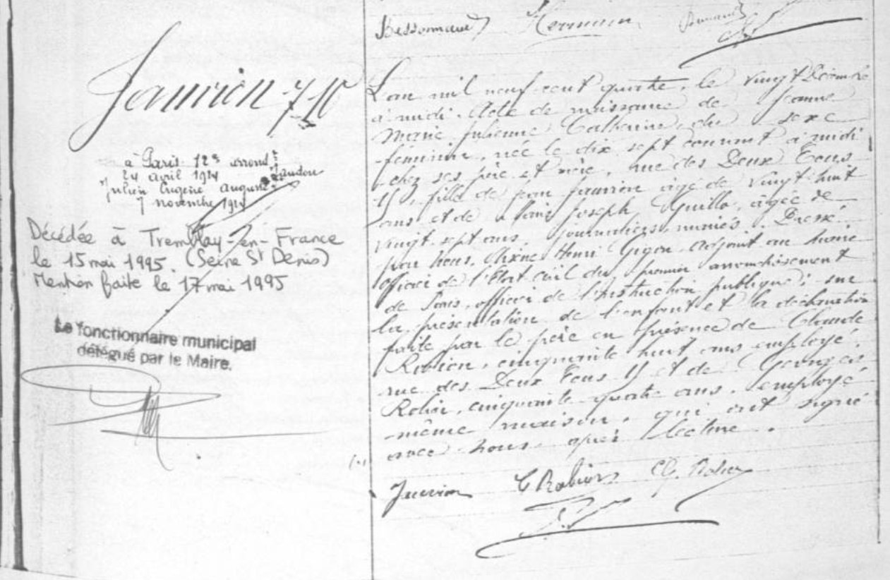 | Prénom | Jeanne Marie Julienne Catherine | | Nom de famille | Jauvion | l'an mil neuf cent quatre le vingt décembre à midi, Acte de naissance de Jeanne Marie Julienne Catherine de sexe féminin née le dix sept courant à midi chez ses père et mère , rue des Deux Pons 1/ fille de Jean Jauvion agé de vingt huit ans et de Marie Joseph Guillo agée de vingt sept ans journaliers munies dresse .... .... .... Henri George adjoint au maire officier de l'Etat civil du premier arrondissement de Paris, officier de l'instruction publique .... la présentation de l'enfant et la déclaration faite par le père en présence de Clem... Ribiere, cinquante huit ans employé rue des Deux Fons 1) et de Ger... Rehac, cinquante quatre ans, employé même maison qui ont signé avec nous après lecture | Naissance (plus...) | 17 décembre 1904 | 12ème arrondissement, Paris, FRANCE (, Paris 12ème, 75012, Paris, Île-de-France, France) | Date et lieu de décès mentionnés sur l'acte de naissance | Décès (plus...) | 15 mai 1995 à l'âge de 91 ans | Tremblay-en-France, Seine-Saint-denis, FRANCE (, Tremblay en France, 93073, Seine Saint Denis, Île-de-France, France) |