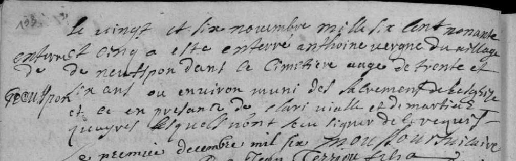 | le vingt et six novembre mille six cent nonante et cinq a esté enterré Anthoine Vergne du village de Neufpon dans le cimetiere agé de trente et six ans ou environ muni des sacrements de l'église et ce en présance de Clari? Vialle et de Martial Preuyres lequels n'ont su signer de ce requis | Décès (plus...) | 26 novembre 1695 à l'âge de 31 ans | Corrèze, Corrèze, FRANCE (Neupont, Corrèze, 19062, Corrèze, Nouvelle-Aquitaine, France) | Témoins Décès | Témoin Clary Viale Témoin Martial Preuyre
