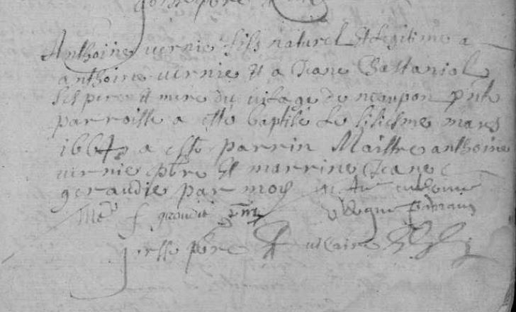 | Prénom | Antoine | | Nom de famille | Vergne | Anthoine Vergne fils naturel et légitime à Anthoine Vernes et à Jeane Chastaniol ses pere et mere du village de Neupi .. paroisse a étté baptisé le sixieme mars 1664 a été parrain maistre Anthoine ... ... et marraine Jeanne Géraudie par moy ... | Naissance (plus...) | 6 mars 1664 | Corrèze, Corrèze, FRANCE (Neupont, Corrèze, 19062, Corrèze, Nouvelle-Aquitaine, France) | | Baptême | 6 mars 1664 | Corrèze, Corrèze, FRANCE (Neupont, Corrèze, 19062, Corrèze, Nouvelle-Aquitaine, France) | Témoins au Bapteme/Naissance | Parrain Antoine Vergne 2102 (27 octobre 1644 - 6 mai 1695) Marraine Jeanne Giraudie