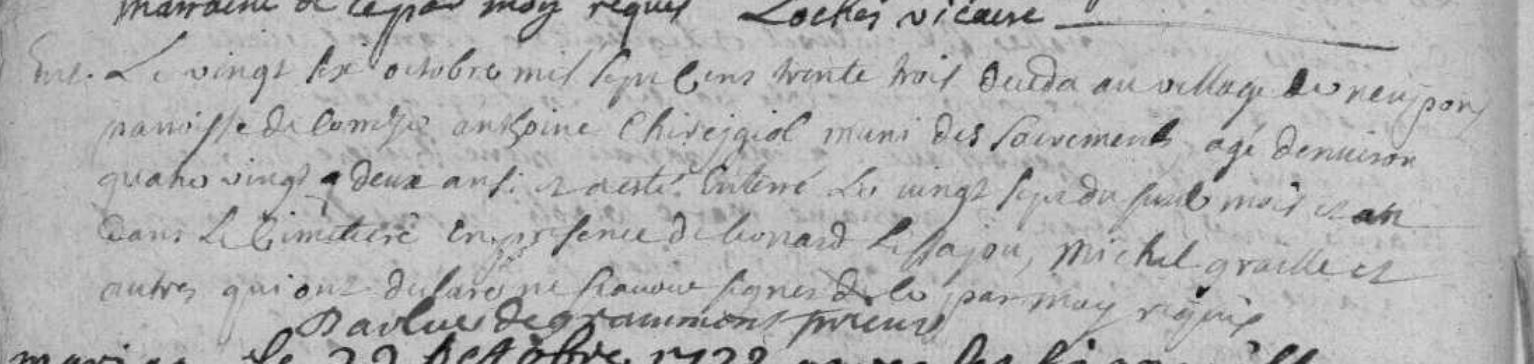 | le vingt six octobre mil sept cents trente trois deceda au village de Neupons paroisse de Corrèze, Anthoine Thiereugeol munis des sacrements agé d'environ quatre vingt deux ans et a esté enterré le vingt sept du ... mpos et dans le cimetiere en présence de leonard lissajou, michel graille et autres qui ont déclaré ,e savoir signer de ce par moy requis