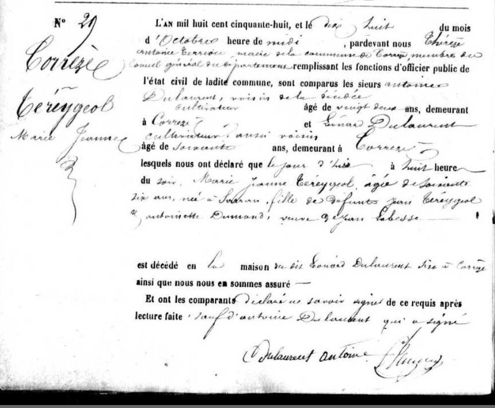 | Prénom | Marie Jeanne | | Nom de famille | Tereygeol | | Naissance | 25 mars 1792 | Sarran, Corrèze, FRANCE (, Sarran, 19251, Corrèze, Nouvelle-Aquitaine, France) | | Baptême | 25 mars 1792 | Sarran, Corrèze, FRANCE (, Sarran, 19251, Corrèze, Nouvelle-Aquitaine, France) | | Décès | 18 octobre 1858 à l'âge de 66 ans | Corrèze, Corrèze, FRANCE (, Corrèze, 19062, Corrèze, Nouvelle-Aquitaine, France) |