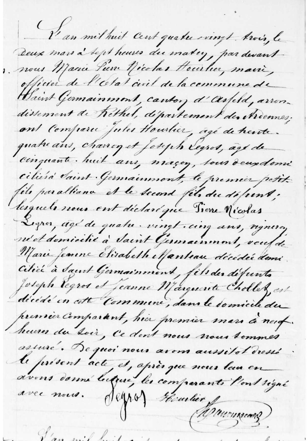 | Prénom | Pierre Nicolas | | Nom de famille | Legros | | Profession | Vigneron | | Naissance | 1799 | | l'an mil huit cent quatre vingt trois, le deux mars à sept heures du matin, par devant nous Marie Pierre Nicolas Hourlier, maire, officier de l'état civil de la commune de Saint-Germainmont, canton d'Asfeld, arrondissement de Rethel, département des Ardennes; ont comparu Jules Hourlier, âgé de trente quatre ans, charron et Joseph Legros, âgé de cinquante huit ans, maçon, tous deux domiciliés à Saint-Germaimont, le premier petit-fils par alliance et le second fils du défunt; lesquels nous ont déclaré que Pierre Nicolas Legros, âgé de quatre vingt cinq ans, vigneron, né et domicilié à Saint-Germainmont, veuf de Marie Jeanne Elisabeth Manteau décédée domiciliée à Saint-Germainmont, fils des défunts Joseph Legros et Jeanne Marguerite Chollet est décédé en cette commune, dans le domicile du premier comparant, hier premier mars à neuf heures du soir, ce dont nous nous sommes assuré. De quoi nous avons aussitôt dressé le présent acte et, après que nous leur en avons donné lecture, les comparants l'ont signé avec nous | Décès (plus...) | 1 mars 1883 à l'âge de 84 ans | Saint-Germainmont, Ardennes, FRANCE (, Saint-Germainmont, 08381, Ardennes, Grand-Est, France) | Témoins Décès | Témoin Joseph Legros (1825) Témoin Jules Hourlier (1849)