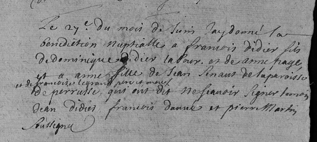 Le 27e du mois de juin, j'ay donné la benediction nuptialle à francois didier fils de dominique didier labour. et de anne page et à anne fille de jean senaut et de fracoise legrand de pere et mere de la paroisse de perussie qui ont dit ne savoir signer, temoins jean didier, francois dauvé et pierre martin soussigné