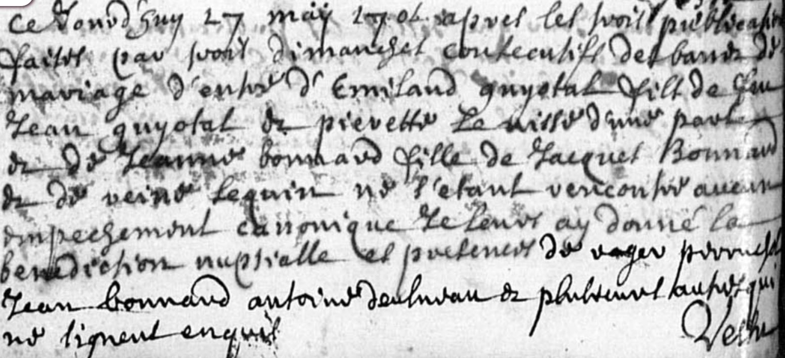 Ce jourd'huy 27 May 1701 apres les trois publications faites par ...dimanches consecutifs des bans de mariage d'entre d'Emiland Guyotat fils de feu Jean Guyotat et Pierrette Lemissu d'une part, et de Jeanne Bonnard fille de Jacques Bonnard et de reine Seguin, ne s'étant rencontré aucun empechement canonique je leur ay donné la bénediction nuptialle et ... d.. ..;; Jean Bonnard Antoinr deulduvan et plusieurs autres qui ne signent enquis