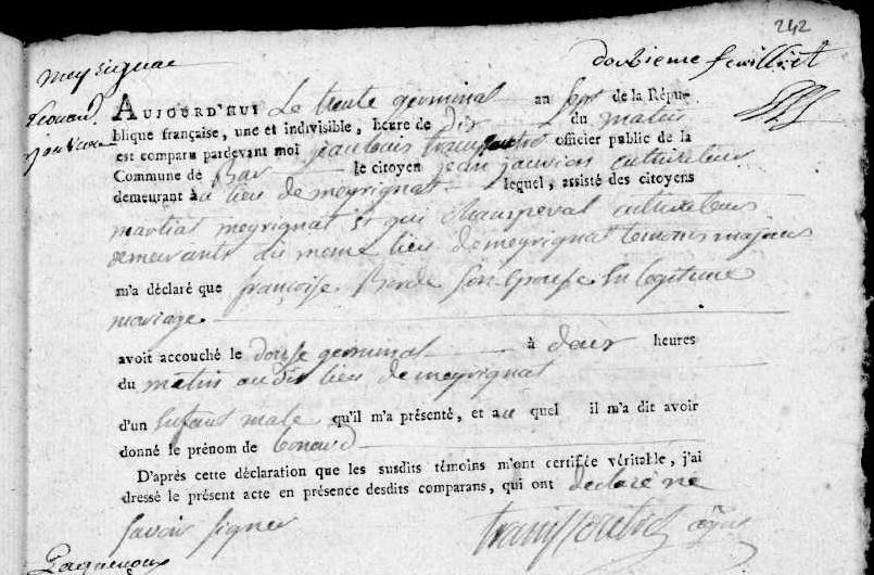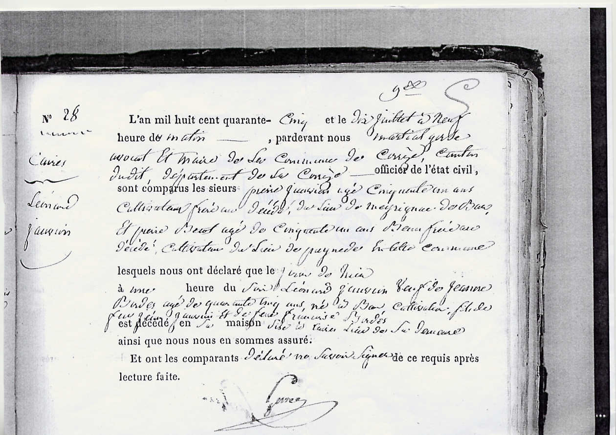 | Prénom | Léonard | | Nom de famille | Jauvion | | Profession | Cultivateur | Aujourd'hui le trente germinal an sept de la République française, une et indivisible, heure de dix du matin est comparu devant moi, jean loui trau... officier public de la commune de Bar le citoyen jean Jauvion cultivateur demeurant au lieu de Meyrignat lequel, assisté des citoyens martial meyrinat ? qui champeval cultivateur demeurant au même lieu de meyrignat temoins majeurs m'a déclaré que Françoise Borde son épouse en légitime mariage avait accouché le douze germinal à deux heures du matin au dit lieu de meyrignat d'un enfant male qu'il m'a présenté, et au quel il m'a dit avoir donné le prénom de léonard D'après cette déclaration que les susdits témoins m'ont certifié véritable, j'ai dressé le présent acte en présence desdits comparants qui ont déclaré ne savoir signer Tramilloutr... | Naissance (plus...) | 19 avril 1799 | Bar, Corrèze, FRANCE (, Bar, 19016, Corrèze, Nouvelle-Aquitaine, France) | Décès Léonard Jauvion. L'an mil huit cent quarante cinq et le dix juillet à neuf heures du matin, pardevant nous, Martial Gorse, Avocat et Maire de la commune de Corrèze, canton dudit département de la Corrèze, officier de létat civil, sont comparus les sieurs Pierre Jauvion âgé de cinquante et un ans cultivateur frère du décédé, du lieu de Meyrignac d..B...., et Pierre Becot agé de cinquante un ans beau frère du décédé, cultivateur du lieu de Paynedes en cette commune lesquels nous ont déclaré que le jour de hier à une heure du soir Léonard Jauvion veuf de Jeanine Bordes âgé de quarante trois ans né à Bar? cultivateur fils de feu Jean Jauvion et de feue Françoise Bordes est décédé en sa maison sise à Caires lieu de sa demeure ainsi que nous en sommes assuré. Et ont les comparants déclaré ne savoir signer de ce requis après lecture faite. | Décès (plus...) | 9 juillet 1845 à l'âge de 46 ans | Corrèze, Corrèze, FRANCE (Cayre, Corrèze, 19062, Corrèze, Nouvelle-Aquitaine, France) | Témoins Décès | Déclarant Pierre Jauvion (17 mars 1794 - 9 juillet 1866) Déclarant Pierre Bécot (10 juillet 1792 - 25 avril 1861) Officier d' Etat Civil Martial Gorse Épouse Jeanine Bordes