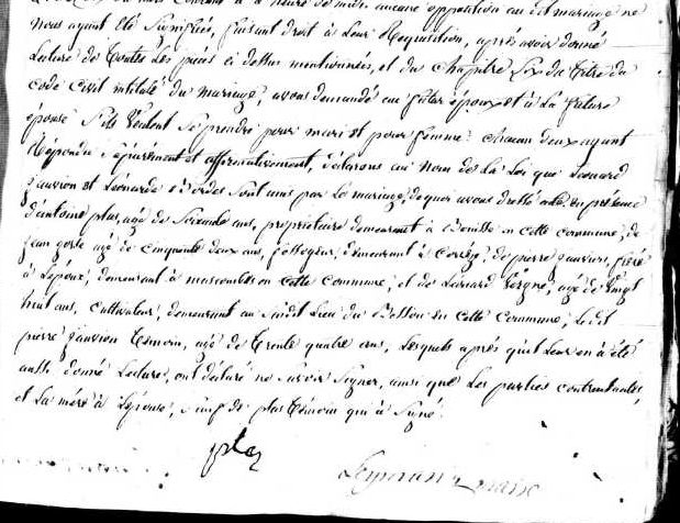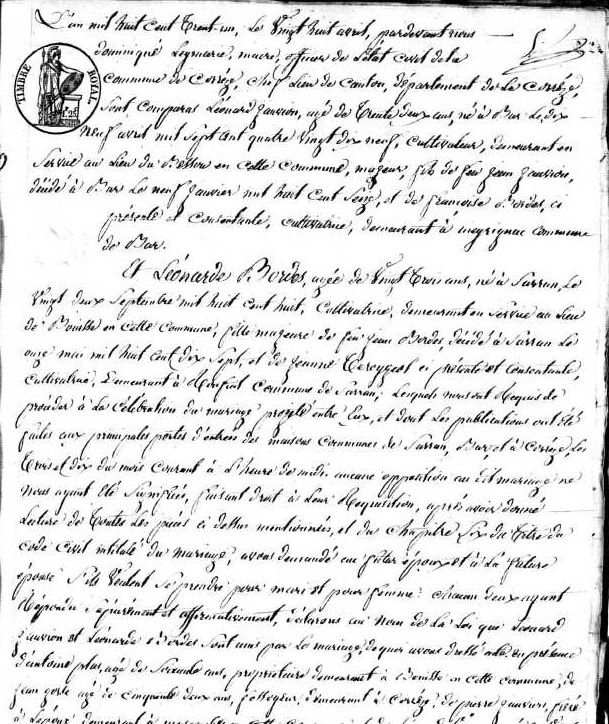 | Union | Léonarde Anne Bordes 65 (22 septembre 1808 - 23 septembre 1843) | L'an mille huit cent trente-un, le vingt huit avril, pardevant nous dominique leyrncerce?, maire, officier de l'état civil de la commune de Corrèze, chef lieu de Canton, département de la Corrèze sont comparus Léonard Jauvion, agé de trente deux ans, né à Bar le dix neuf avril mil sept cent quatre vingt dix neuf, cultivateur, demeurant en Ser? au lieu du Besserd? en cette commune, majeur, fils de feu jean Jauvion décédé à Bar le neuf janvier mil huit cent seize et de Françoise Bordas ci présente et consentante, cultivatrice, demeurant à Meyrignac commune de Bar Et Léonarde Bordes, agée de vingt trois ans, née à Sarran le vingt deux septembre mil huit cent huit, cultivatrice, demeurant en ? au lieu de Bouisse en cette commune fille majeure de feu jean bordes décédé à Sarran le onze mai mil huit cent dix sept et de jeanne Tereygol ci présente et consentante cultivatrice demeurant à Monteil? commune de Sarran lequels nous ont requis de procéder à la célébration du mariage projeté entre eux et dont les publications ont été faites aux principales portes d'entrée de nos maisons communes de Sarran, Bar et ...les trois et dix du mois courant à l'heure de .. .... .... opposition ... ne nous ayant été signifié.... .... .... en présence d'Antoine Plat? agé de soixante ans propriétaire demeurant à Bouisse? en cette commune de Jean Gorce agé de cinquante deux ans .... demeurant à Corrèze et de Pierre Jauvion frère à l'époux demeurant à Massemb? en cette commune, le dit Pierre Jauvion ... agé de trente quatre ans | Mariage (plus...) | 28 avril 1831 à l'âge de 32 ans | Corrèze, Corrèze, FRANCE (, Corrèze, 19062, Corrèze, Nouvelle-Aquitaine, France) | Enfant(s) | Michel Jauvion (15 avril 1832 - 13 janvier 1894)