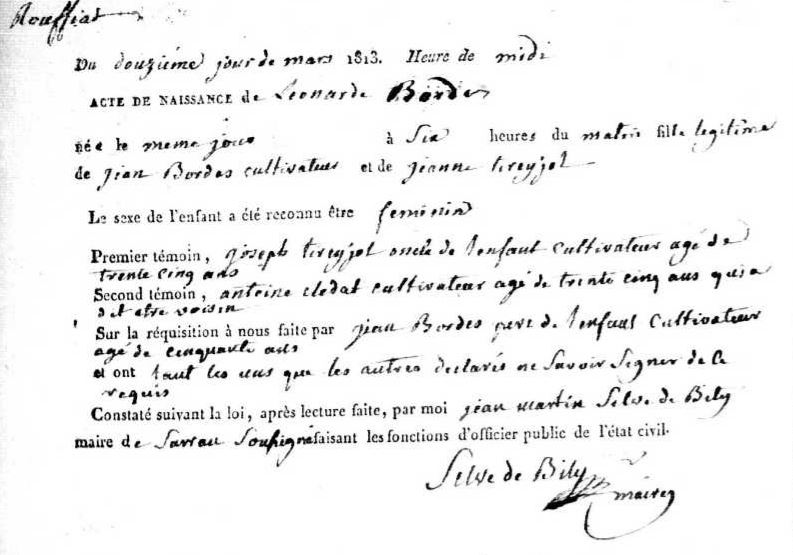Et Léonarde Bordes, agée de vingt six ans, née à Sarran, le douze mars mil huit cent treize, cultivateur au lieu dit de Reignac en cette commune fille, majeure de feue Jean Bordes , décédé à Sarran le onze mai mil huit cent dix sept et de Jeanne Tereygeol, cultivateur, demeurant à roufiac commune de Sarran ci présente et consentante, lesquels nous ont requis de procéder à la célabration du mariage projeté entre eux et dont les publications ont été faites devant les principales portes des maisons communes de Corrèze et Sarran les cinq et douze du mois courant de dix heures du matin, aucune opposition audit mariage ne nous ayant été signifiée, faisant droit à leur réquisition après avoir donné lecture de toutes les pièces ci dessus mentionnées et du chapitre six du titre du code civil intitulé du mariage avons demandé aux futur epoux et à la future épouse, s'ils veulent se prendre pour mari et pour femme, chacun d'eux ayant répondu séparément et affirmativement déclarons au nom de la loi que Antoine Mercier et Léonarde Bordes sont unis pas le mariage, de quoi avons dressé acte en présence de François Chassage, agé de cinquante deux ans, cultivateur, dudit lieu de Reignac, en cette commune, de Léonard Jauvion agé de trente neuf ans, cultivateur, du lieu de ... commune de Sarran, Beau frère de l'épouse, de jean pierre mercier agé de trente sept ans et d'étienne mercier, agé de trente trois ans, tous les deux cultivateurs demeurant à Brousse en cette commune, fréres à l'époux, lesquels après qu'il leur a été ... donné lecture ont déclaré ne savoir signer ainsi que les parties con... et leurs pere et mere