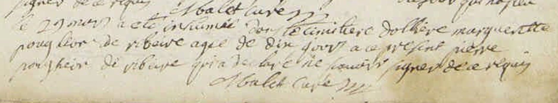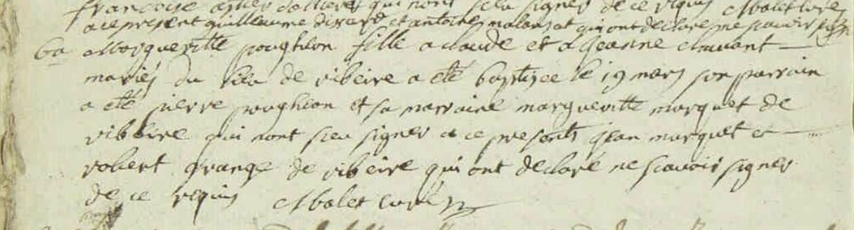 | Prénom | Marguerite | | Nom de famille | Poujon | Marguerite poughon fille à claude et à jeanne chavant mariés du lieu de ribeire a été baptisée le 19 mars son parrain a été pierre poughon et sa marraine marguerite marquet de .... qui n'ont pu signer et ce présents jean marquet et robert grange de ribeire qui ont déclaré ne savoir signer de ce requis | Naissance (plus...) | 19 mars 1762 | Saint-Martin-d'Ollières, Puy-de-dôme, FRANCE (Ribeyre, Saint-Martin-d'Ollières, 63376, Puy de Dôme, Auvergne-Rhône-Alpes, France) | | Baptême | 19 mars 1762 | Saint-Martin-d'Ollières, Puy-de-dôme, FRANCE (, Saint-Martin-d'Ollières, 63376, Puy de Dôme, Auvergne-Rhône-Alpes, France) | le 29 mars a été inhumée dans le cimetiere d'Ollière marguerite Poughon de Ribeire âgée de dix jours a été présent pierre poughon de ribeire qui a déclane ne pouvoir signer de ce requis | Décès (plus...) | 29 mars 1762 < 1 ans | Saint-Martin-d'Ollières, Puy-de-dôme, FRANCE (, Saint-Martin-d'Ollières, 63376, Puy de Dôme, Auvergne-Rhône-Alpes, France) |