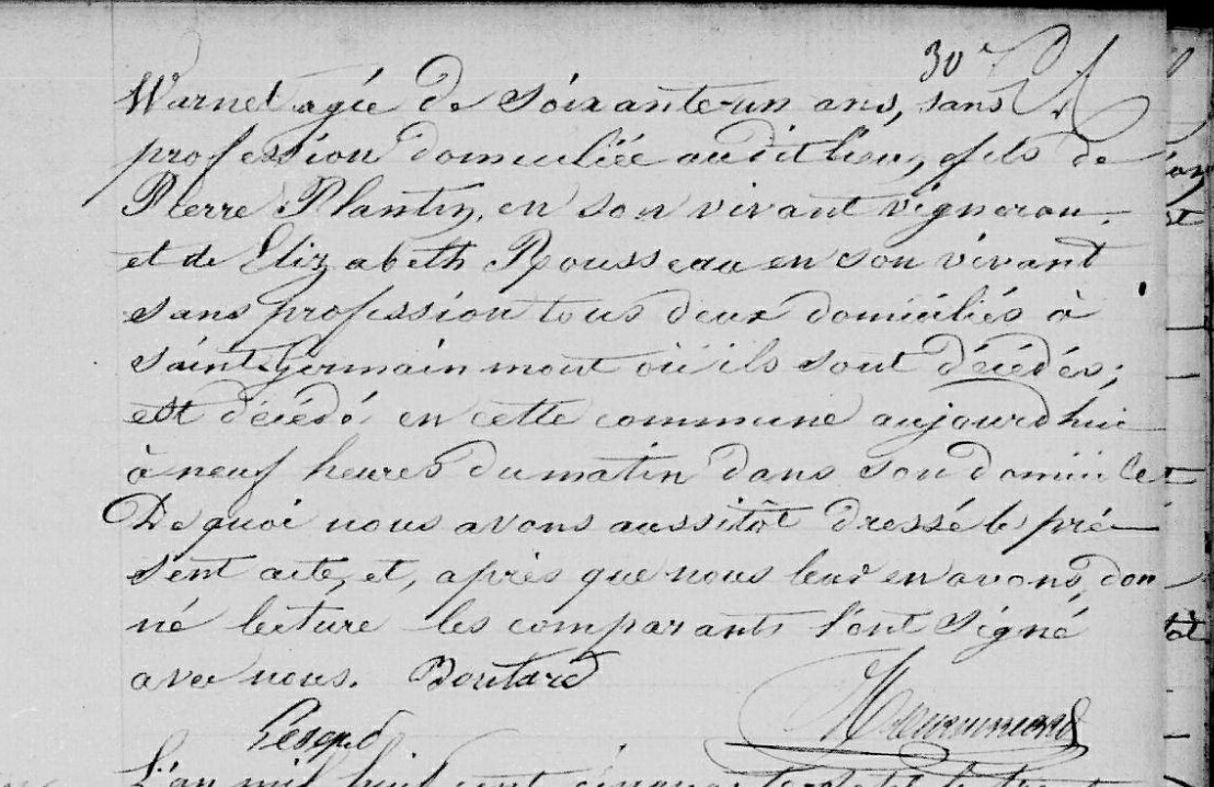 | Prénom | Nicolas Joseph | | Nom de famille | Plantin | | Profession | Vigneron | | Naissance | 1797 | Saint-Germainmont, Ardennes, FRANCE (, Saint Germainmont, 08381, Ardennes, Grand-Est, France) | l'an mil huit cent cinquante sept et le vingt sept septembre à une heure de l'après midi par de- vant nous Marie Pierre Nicolas Hourlier marie remplissant les fonctions d'officier de l'état civil de la commune de Saint-Germainmont, Canton d'Asfeldn arrondissement de Rethel dé- partement des Ardennes ont comparu Jean Baptiste Boutard âgé de quarante-un ans vigneron et Joseph Lesget âgé de cinquante deux ans vigneron, tous deux voisins au décédé et domiciliés à Saint-Germainmont lesquels nous ont déclaré que Nicolas Joseph Plantin âgé de soixante-un ans vigneron domicilié à Saint Germain mont où il est né, époux de Josephine Warnet agée de soixant-un ans, sans profession domiciliée au dit lieu, fils de Pierre Plantin en son vivant vigneron et de Elizabeth Rousseau en son vivant sans profession tous deux domiciliés à Saint-Germaimont où ils sont décédés; est décédé en cette commune aujourd'hui à neuf heures du matin dans son domicile De quoi nous avons aussitôt dressé le pré- sent acte et, après que nous leur en avons don- né lecture les comparants ont signé avec nous - | Décès (plus...) | 27 septembre 1857 à l'âge de 60 ans | Saint-Germainmont, Ardennes, FRANCE (, Saint-Germainmont, 08381, Ardennes, Grand-Est, France) |