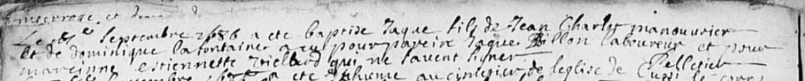 | Prénom | Jacques | | Nom de famille | Charlot | | Profession | Métayer 'le prey' | | Naissance | 17 septembre 1686 | Cussy-en-Morvan, Saône-et-Loire, FRANCE (, Cussy-en-Morvan, 71165, Saône et Loire, Bourgogne-Franche-Comté, France) | | Baptême | 17 septembre 1686 | Cussy-en-Morvan, Saône-et-Loire, FRANCE (, Cussy-en-Morvan, 71165, Saône et Loire, Bourgogne-Franche-Comté, France) | | Décès | 14 février 1717 à l'âge de 31 ans | Cussy-en-Morvan, Saône-et-Loire, FRANCE (, Cussy-en-Morvan, 71165, Saône et Loire, Bourgogne-Franche-Comté, France) |