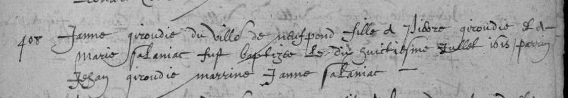 | Prénom | Jeanne | | Nom de famille | Giraudie | Jeanne Giraudie du village de Neufpond fille de ? Giraudie et de Marie Salanier fut baptisé le dix huitieme juillet 1615 parrain Jehan Giraudie marraine Anne Salanier | Naissance (plus...) | 18 juillet 1615 | Corrèze, Corrèze, FRANCE (, Corrèze, 19062, Corrèze, Nouvelle-Aquitaine, France) | | Baptême | 18 juillet 1615 | Corrèze, Corrèze, FRANCE (, Corrèze, 19062, Corrèze, Nouvelle-Aquitaine, France) | Témoins au Bapteme/Naissance | Parrain Jean Giraudie Marraine Anne Salagnat