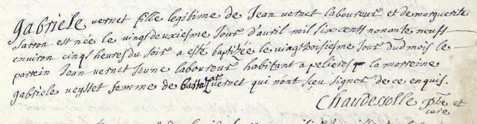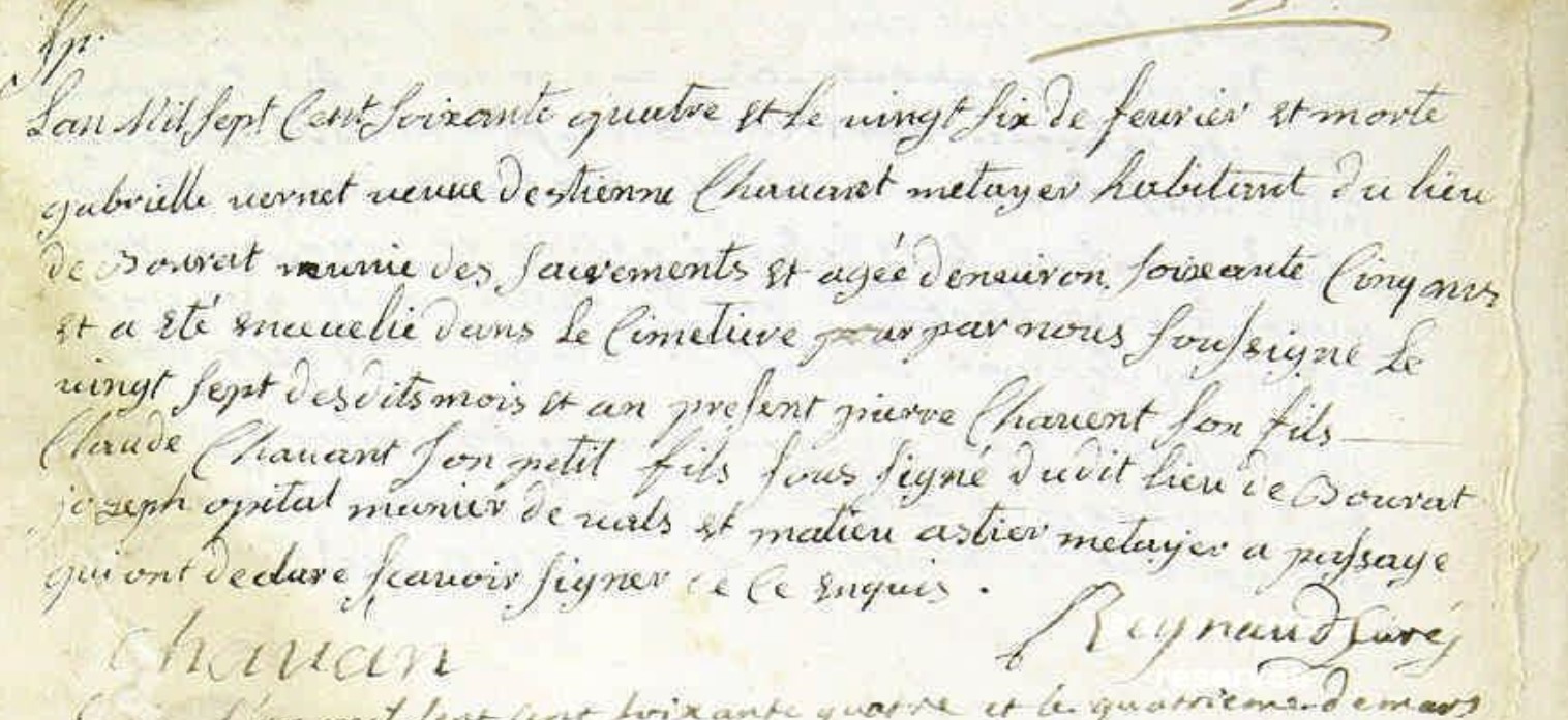 | Prénom | Gabrielle | | Nom de famille | Vernet | Gabriele Vernet fille légitime de Jean Vernet laboureur et de Marguerite Sarron est née le vingt-deuxieme jour d'avril mil six cent nonante neuf environ cinq heures du soir a esté baptizée le vingt-troisieme jour du mois. le parrain Jean Vernet Jeune laboureur habitant à Pelieres, la marraine Gabriele Neysset femme de ? Vernet qui n'ont su signer de ce requis | Naissance (plus...) | 22 avril 1699 | Champagnat-le-Jeune, Puy-de-dôme, FRANCE (, Champagnat-le-Jeune, 63079, Puy de Dôme, Auvergne-Rhône-Alpes, France) | | Baptême | 22 avril 1699 | Champagnat-le-Jeune, Puy-de-dôme, FRANCE (, Champagnat-le-Jeune, 63079, Puy de Dôme, Auvergne-Rhône-Alpes, France) | l'an mil sept cent soixante quatre et le vingt six de février est morte Gabrielle Vernet veuve de Estienne Chavant métayer habitant du lieu de Boivert munie des sacrements et agée d'environ soixante cinq ans et a été ensevelie dans le cimetiere par nous soussigné le vingt sept des dits mois et an Présent Pierre Chavan son fils, Claude Chavan son petit fils sous signé dudit lieu de Bourat, Josept Opital meunier de nals et Matieu Astier, Metayer à Persaye qui ont déclaré savoir signer de ce requis | Décès (plus...) | 26 février 1764 à l'âge de 65 ans | Valz-sous-Châteauneuf, Puy-de-dôme, FRANCE (, Valz-sous-Châteauneuf, 63442, Puy de Dôme, Auvergne-Rhône-Alpes, France) | Témoins Décès | Témoin Claude Chevant Témoin Joseph Opital Témoin Matieu Astier Témoin Pierre Chevant (1720)