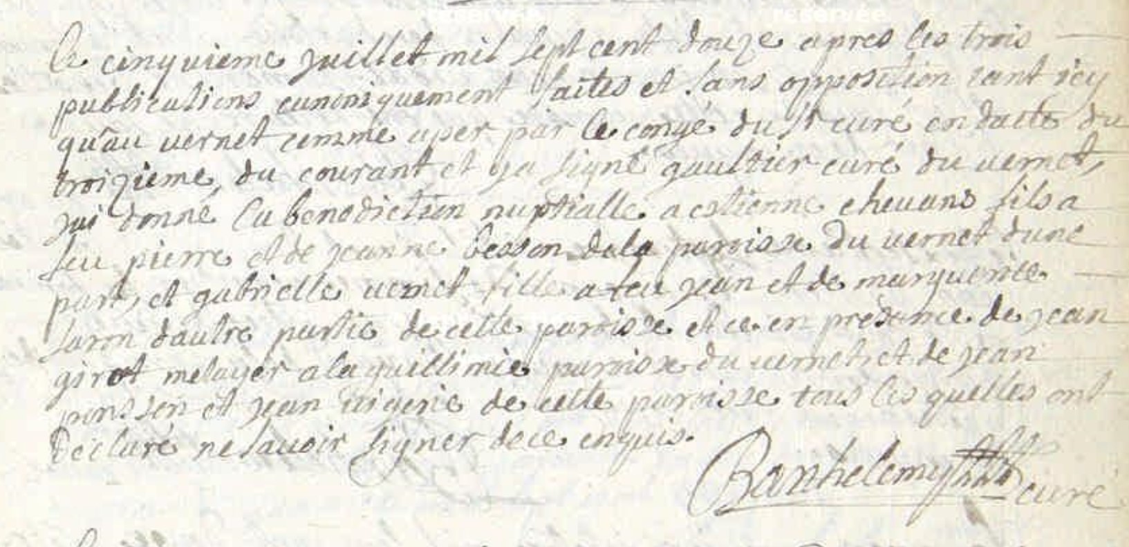 | Union | Etienne Chevant 1218 (1689 - 30 mars 1757) | le cinquieme juillet mil sept cent douze après les trois publicatios .... faites et sans opposition .... ... qu... verbet comme ... par le congé du ... en .'acte du troisieme, du courant et .. signé Gaultier curé du ... qui donne la bénédiction nuptialle à Estienne Chevans fils à feu Pierre et de Jeanne Besson de la paroissse du vernet d'une part, et Gabrielle Vernet, fille à feu Jean et de Marguerite Sarron, autre partie de cette paroisse et ce en présence de Jean Girot métayer à la Guillimie paroisse du Vernet et de Jean Pinsson et Jean Vigine de cette paroisse tous lesquelles ont déclaré ne savoir signer de ce requis | Mariage (plus...) | 5 juillet 1712 à l'âge de 13 ans | Champagnat-le-Jeune, Puy-de-dôme, FRANCE (, Champagnat-le-Jeune, 63079, Puy de Dôme, Auvergne-Rhône-Alpes, France) | Témoins au Mariage | Mère Marguerite Sarron 2439 (1675 - 5 décembre 1742) Témoin Jean Girot Témoin Jean Vigerie Témoin Jean Pinsson