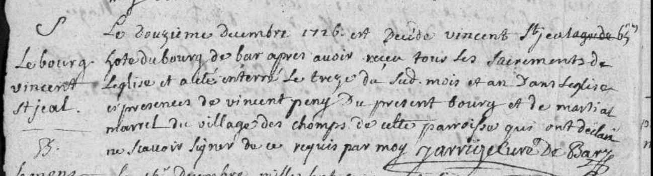 | Prénom | Vincent | | Nom de famille | Saint-Jal | | Naissance | 21 juillet 1661 | Bar, Corrèze, FRANCE (, Bar, 19016, Corrèze, Nouvelle-Aquitaine, France) | | Baptême | 21 juillet 1661 | Bar, Corrèze, FRANCE (, Bar, 19016, Corrèze, Nouvelle-Aquitaine, France) | | Décès | 12 décembre 1726 à l'âge de 65 ans | Bar, Corrèze, FRANCE (, Bar, 19016, Corrèze, Nouvelle-Aquitaine, France) |