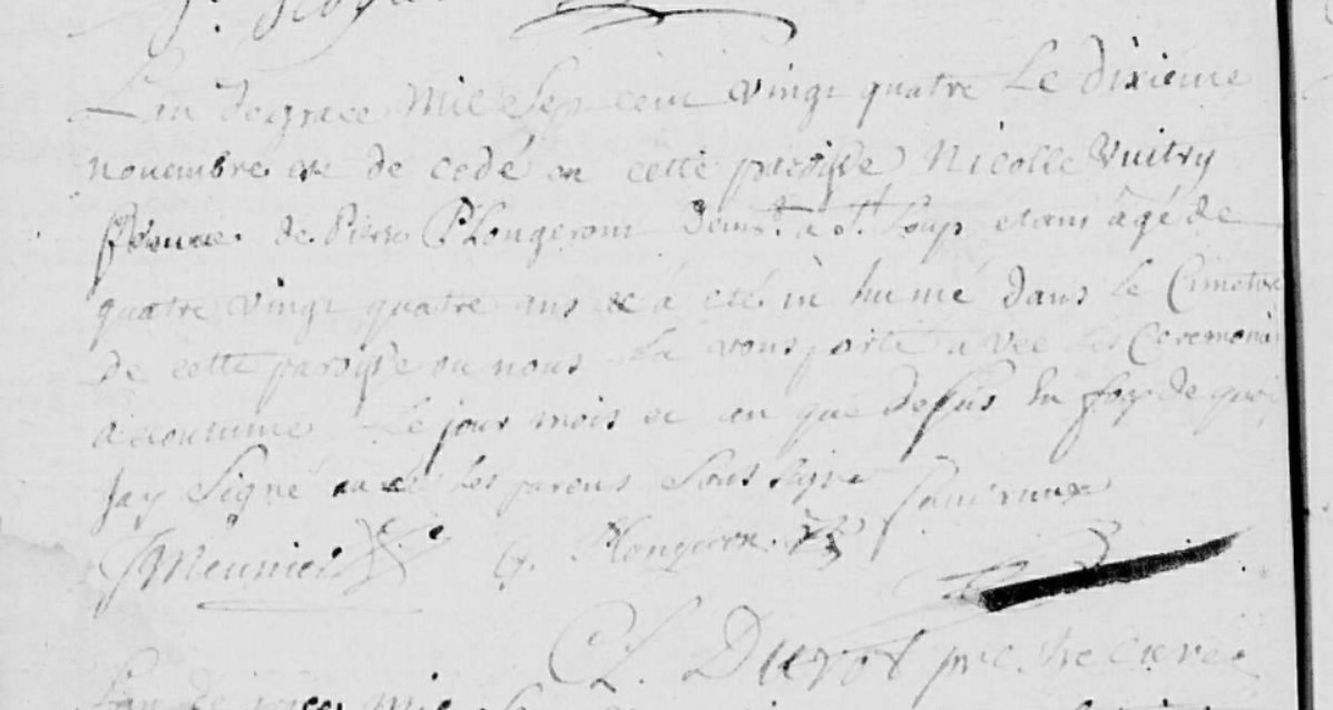 l'an de grace mil sept cent vingt quatre le dixieme novembre est decedé en cette paroisse Nicolle Vuitry femme de Pierre Plongeron demeurant à St Loup étant âgée de quatre vingt quatre ans, a été inhumé dans le cimetiere de cette paroisse ou nous l'avons porté avec les cérémonies accoutim le jour mois de en que ... la foy de quoi j'ay signé avec les parens soussigné