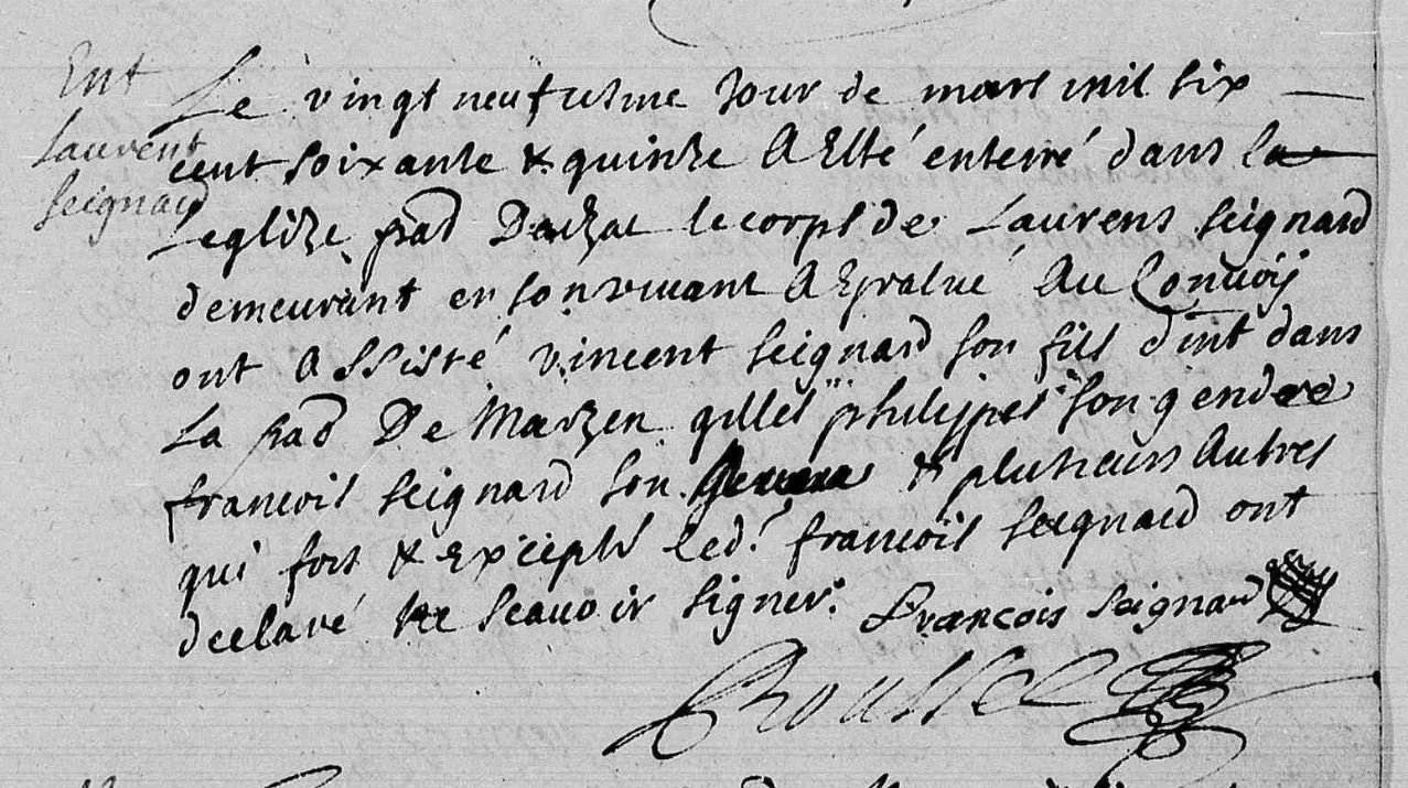 Le vingt neuvieme jour de mars mil six cent soixante & quinze a été enterré dans l'église ... d'Arzal le corps de laurens seignard demeurant en son vivant à ... du connoy ont assisté vincent seignard son fils demeurant dans la paroisse de Marzen, Gilles Philippe son gendre, françois seignard son neveu et plusieurs autres qui... et ... ledit françois seignard ont déclaré ne savoir signer
