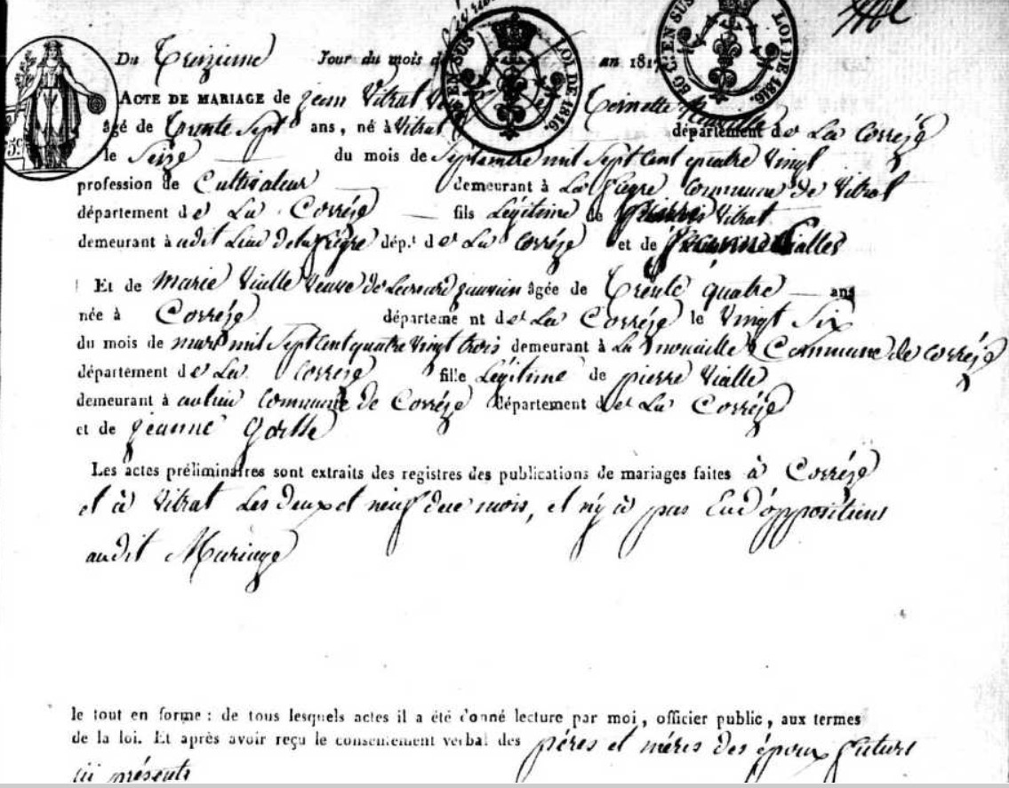 | Union | Jean Vitrac (16 septembre 1780 - 3 décembre 1838) | Du treizieme jour du mois de février an 1817 Acte de Mariage de Jean Vitrat veuf de Toinette Neuville âgé de trente sept ans, né à Vitrat département de la corrèze le seize du mois de septembre mil sept cent quatre vingt profession de cultivateur demeurant à la Fieyre? commune de Vitral département de la Corrèze fils légitime de Pierre? Vitrac audit liey de la fiegre? dép de la corrèze et de Jeanne? Salles? Et de Marie Vialle veuve de Léonard Jauvion âgé de trente quatre ans née à Corrèze département de la Corrèze le vingt six du mois de mars mil sept cent quatre vingt trois demeurant à la Nouaille commune de Corrèze département de la Corrèze fille légitime de Pierre Vialle demeurant à ? commune de Corrèze département de la Corrèze et de Jeanne Gorsse A vérifier : - Veuve de Léonard ? Jauvion ... s'agit-il bien de Martial Jauvion comme trouvé ? - Vialle Marie dans cet acte serait née le 26/3/1783 ? Acte trouvé au 26/3/1782 | Mariage (plus...) | 13 février 1817 à l'âge de 35 ans | Corrèze, Corrèze, FRANCE (, Corrèze, 19062, Corrèze, Nouvelle-Aquitaine, France) | Enfant(s) | Jean Baptiste Vitrac (13 octobre 1819 - 21 février 1883)
