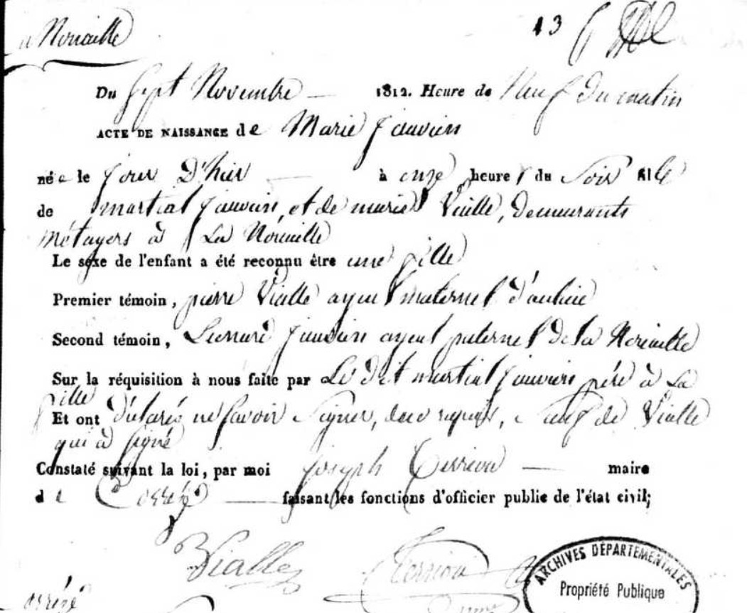 | Prénom | Marie | | Nom de famille | Jauvion | Du sept Novembre 1812 heure de neuf du matin Acte de naissance de Marie Jauvion née le jour d'hier à onze heures du soir ... de Martial Jauvion et de de Marie Vialle, Demeurants métayers à la Nouaille Le sexe de l'enfant a été reconnu être une fille Premier témoin, Pierre Vialle ayeul maternel d'aulière Second témoin, Léonard Jauvion ayeul paternele de la Her? Sur la réquisition à nous faite par le dit Martial Jauvion père à la fille Et ont déclarés ne savoir signer de ce requis, sauf de Vialle qui a signé Constaté suivant le loi, par moi Joseph Cerrei? maire à Corrèze faisant les offices d'officier de l'état civil. | Naissance (plus...) | 6 novembre 1812 | Corrèze, Corrèze, FRANCE (, Corrèze, 19062, Corrèze, Nouvelle-Aquitaine, France) | Témoins au Bapteme/Naissance | Ayeul paternel Léonard Jauvion (21 novembre 1743 - 19 février 1814) Ayeul Pierre Vialle