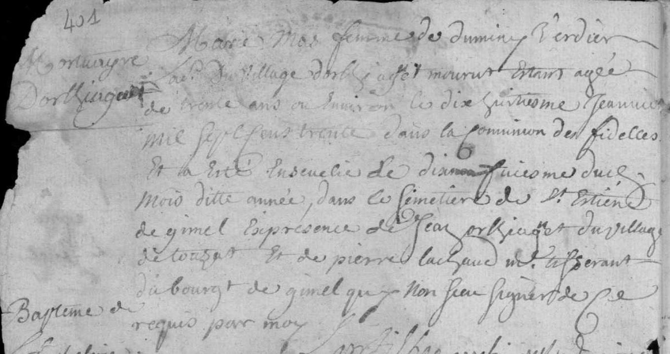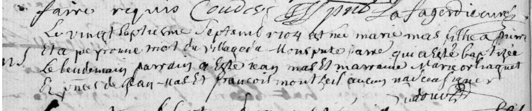 | Prénom | Marie | | Nom de famille | Mas | | Naissance | 27 septembre 1704 | Bar, Corrèze, FRANCE (Mons, Bar, 19016, Corrèze, Nouvelle-Aquitaine, France) | | Baptême | 27 septembre 1704 | Bar, Corrèze, FRANCE (, Bar, 19016, Corrèze, Nouvelle-Aquitaine, France) | | Décès | 18 janvier 1730 à l'âge de 26 ans | Gimel-les-Cascades, Corrèze, FRANCE (, Gimel-les-Cascades, 19085, Corrèze, Nouvelle-Aquitaine, France) |