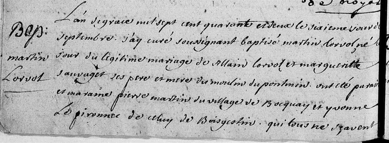 | Prénom | Martin | | Nom de famille | Lorvol | | Naissance | 6 septembre 1742 | Noyal-Muzillac, Morbihan, FRANCE (Le Pomin, Noyal-Muzillac, 56149, Morbihan, Bretagne, France) | | Baptême | 6 septembre 1742 | Noyal-Muzillac, Morbihan, FRANCE (, Noyal-Muzillac, 56149, Morbihan, Bretagne, France) | Témoins au Bapteme/Naissance | Parrain Pierre Martin Marraine ?
