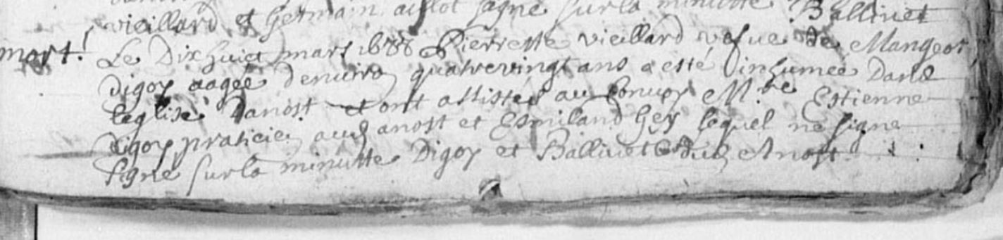 | Union | Mangeot Digoy (? - 15 février 1686) | Mariage (avec Pierrette VIEILLARD) - Roussillon-en-Morvan, 71376, Saône-et-Loire, Bourgogne, FRANCE Voir à Roussillon 20/2/1642 P17 registre mariage Dimanche Digoy et Pierrette Viellard Baron Sources: Acte de mariage - Mariage Digoy/Viellard 1642 - Archives Saone-et-Loire - 4E 376/1 - 5 Mi 439 p 17 - Numerisation - Disque externe - Dimanche digoy & pierrette viellard baron ont estes espouses le 20 febvrier 1642 (aucune certitude s'il s'agit des bonnes personnes) | Mariage (plus...) | 20 février 1642 à l'âge de 23 ans | Roussillon-en-Morvan, Saône-et-Loire, FRANCE (, Roussillon-en-Morvan, 71376, Saône et Loire, Bourgogne-Franche-Comté, France) | Enfant(s) | Marie Digoy (? - après 1674)