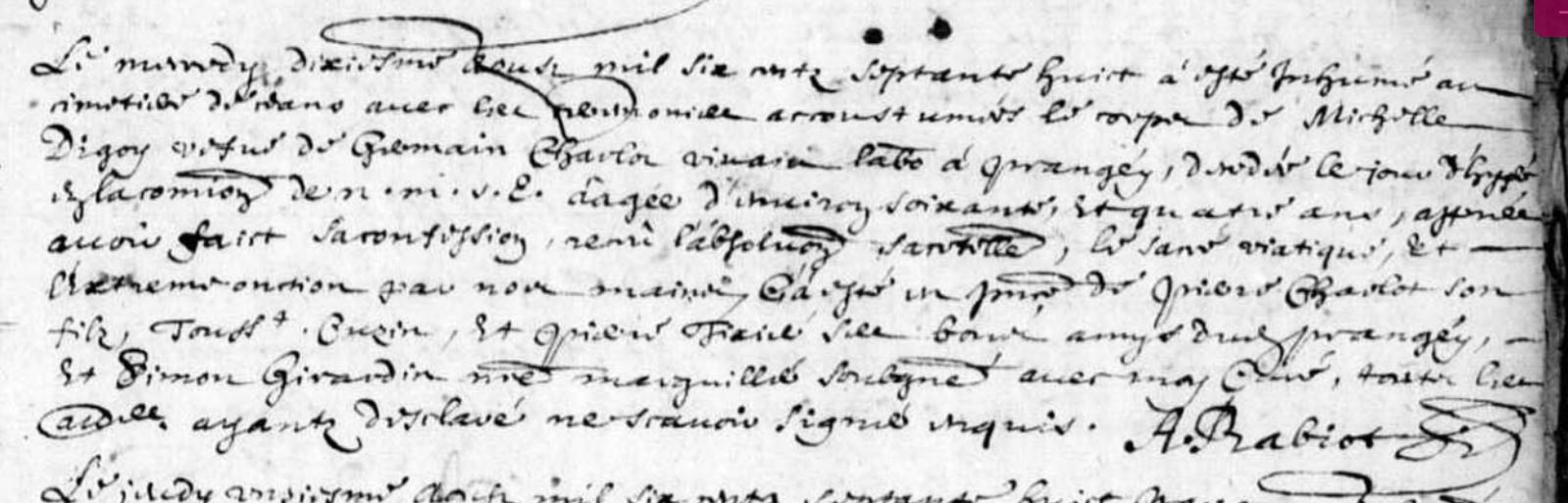 | Prénom | Michelle | | Nom de famille | Digoy | | Naissance | 1614 | Cussy-en-Morvan, Saône-et-Loire, FRANCE (, Cussy-en-Morvan, 71165, Saône et Loire, Bourgogne-Franche-Comté, France) | | Décès | 9 août 1678 à l'âge de 64 ans | Sommant, Saône-et-Loire, FRANCE (, Sommant, 71527, Saône et Loire, Bourgogne-Franche-Comté, France) |