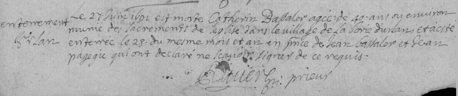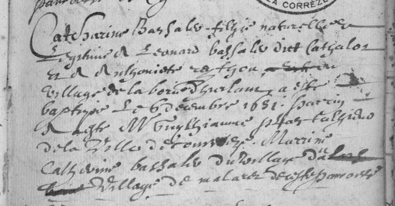 | Prénom | Catherine | | Nom de famille | Bassaler | | Naissance | 6 décembre 1651 | Corrèze, Corrèze, FRANCE (La Borie d'Urlan, Corrèze, 19062, Corrèze, Nouvelle-Aquitaine, France) | | Baptême | 6 décembre 1651 | Corrèze, Corrèze, FRANCE (, Corrèze, 19062, Corrèze, Nouvelle-Aquitaine, France) | | Décès | 27 juin 1691 à l'âge de 40 ans | Corrèze, Corrèze, FRANCE (La Borie d'Urlan, Corrèze, 19062, Corrèze, Nouvelle-Aquitaine, France) |