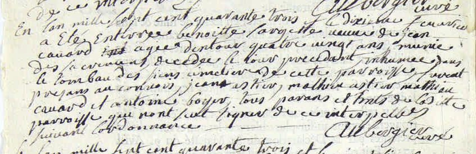 En l'an mille sept cent quarante trois et le dixieme février a été enterré Benoitte Fargette veuve de Jean Cavard, âgée d'autour quatre vingt cinq ans munie des sacremens décédée le jour précédant inhumée dans le tombeau des siens cimetiere de cette paroisse furent présents au convois Jean Astier, Mathieu Astier, Mathieu Cavard et Antoine Boyer tous parents et tous de laditte paroisse qui n'on su signer de ce interpellées suivant l'ordonnance