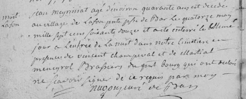 | | Décès | 14 mai 1772 à l'âge de 72 ans | Bar, Corrèze, FRANCE (Moulin de meyriniac, Bar, 19016, Corrèze, Nouvelle-Aquitaine, France) |
