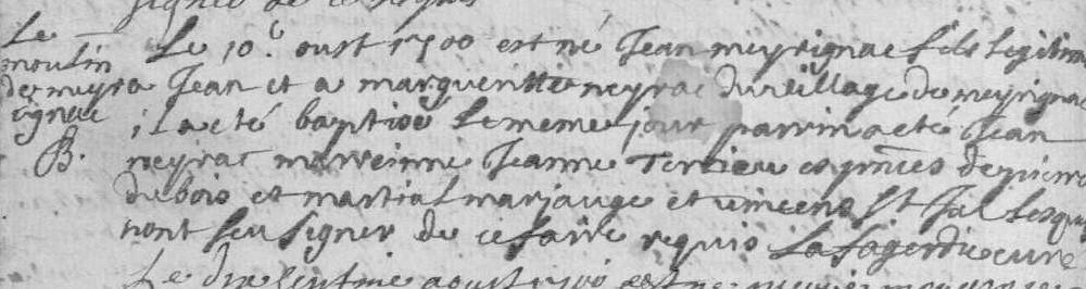| Prénom | Jean | | Nom de famille | Meyriniat | | Profession | Drapier | Le 10 aout est né Jean Meyrignac fils légitime de jean et à Marguerite Neyrac du Village de Meyrignac et a été baptisé le même jour parrain a été Jean Neyrac marraine Jeanne Terriou... | Naissance (plus...) | 10 août 1700 | Bar, Corrèze, FRANCE (Moulin de meyriniac, Bar, 19016, Corrèze, Nouvelle-Aquitaine, France) | Témoins au Bapteme/Naissance | Marraine Jeanne Terriou Parrain Jean Neyrat