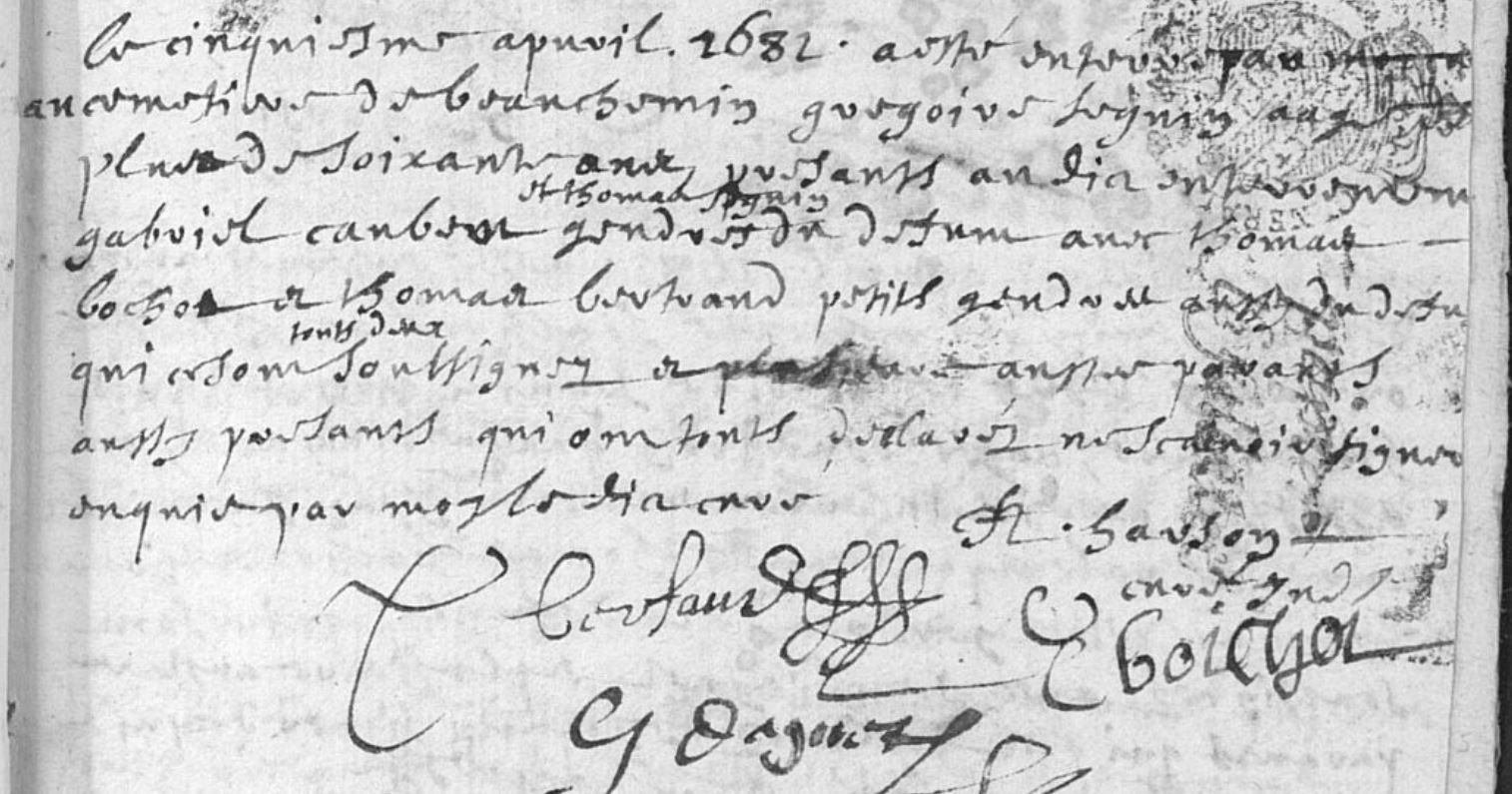 Le cinquieme avril 1682 a été inhumé par moi ... de beauchemin grégoire Seguin agé de ... soixante ans