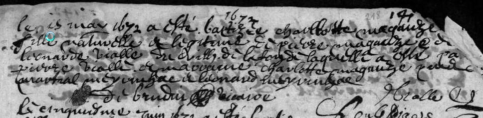 | Prénom | Charlotte | | Nom de famille | Monzauge | | Naissance | 1 mai 1672 | Bar, Corrèze, FRANCE (Le Bos, Bar, 19016, Corrèze, Nouvelle-Aquitaine, France) | | Baptême | 1 mai 1672 | Bar, Corrèze, FRANCE (, Bar, 19016, Corrèze, Nouvelle-Aquitaine, France) |