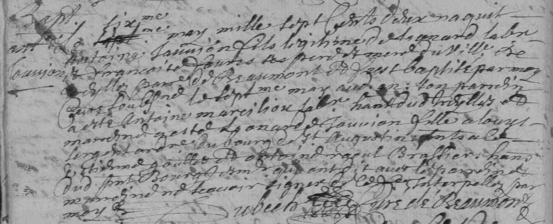 | Prénom | Antoine | | Nom de famille | Jouvion | | Profession | Laboureur | Le six may mille sept cent deux naquit antoine jauvion fils légitime de léonard et de françoise Faure ses pere et mere du village de .... de Beaumont et fut baptisé par nous.... le septieme mai ... parrain a été antoine marishou ...et marraine Léonarde Jauvion fille à .. du bourg de saint augustin ... | Naissance (plus...) | 6 mai 1702 | Beaumont, Corrèze, FRANCE (, Beaumont, 19020, Corrèze, Nouvelle-Aquitaine, France) | | Baptême | 6 mai 1702 | |