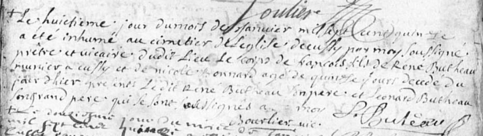 | Prénom | François | | Nom de famille | Buteau | | Naissance | 25 décembre 1714 | Cussy-en-Morvan, Saône-et-Loire, FRANCE (, Cussy-en-Morvan, 71165, Saône et Loire, Bourgogne-Franche-Comté, France) | | Baptême | 25 décembre 1714 | Cussy-en-Morvan, Saône-et-Loire, FRANCE (, Cussy-en-Morvan, 71165, Saône et Loire, Bourgogne-Franche-Comté, France) | | Décès | 8 janvier 1715 à l'âge de 1 ans | Cussy-en-Morvan, Saône-et-Loire, FRANCE (, Cussy-en-Morvan, 71165, Saône et Loire, Bourgogne-Franche-Comté, France) |