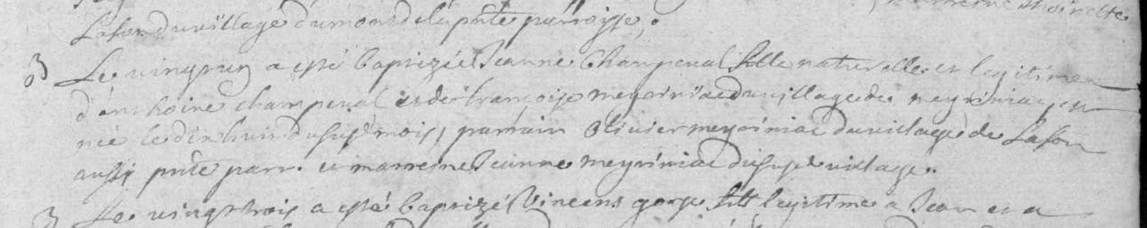 | Prénom | Jeanne | | Nom de famille | Champeval | le vingt... a esté baptizée Jeanne Champeval fille naturelle et légitime d'Antoine Champeval et de Françoise Mey... du village de Meyriniac, est née le dix huit du ... mois Parrain Olivier Meyriniac du village de Lafon ... ... parr. .. ... Jeanne Meyriniac du... .. village | Naissance (plus...) | 21 février 1695 | Bar, Corrèze, FRANCE (Meyrignac, Bar, 19016, Corrèze, Nouvelle-Aquitaine, France) | | Baptême | 21 février 1695 | Bar, Corrèze, FRANCE (, Bar, 19016, Corrèze, Nouvelle-Aquitaine, France) | le septieme aout 1738 a été enterrée dans l'église Jeanne Champeval veuve de Vincent Peny laboureur décédée le jour précédent dans le bourg de Bar agée de quarante ans ou environ apres avoir reçu tous les sacrements de l'église ont été présen à son enterrement Pierre et Martial Vialle métayers du seigneur de Bar et habitans du .... Bourg qui ont déclaré ne savoir signer ce requis par moi Duhamel Curé | Décès (plus...) | 6 août 1738 à l'âge de 43 ans | Bar, Corrèze, FRANCE (, Bar, 19016, Corrèze, Nouvelle-Aquitaine, France) |
