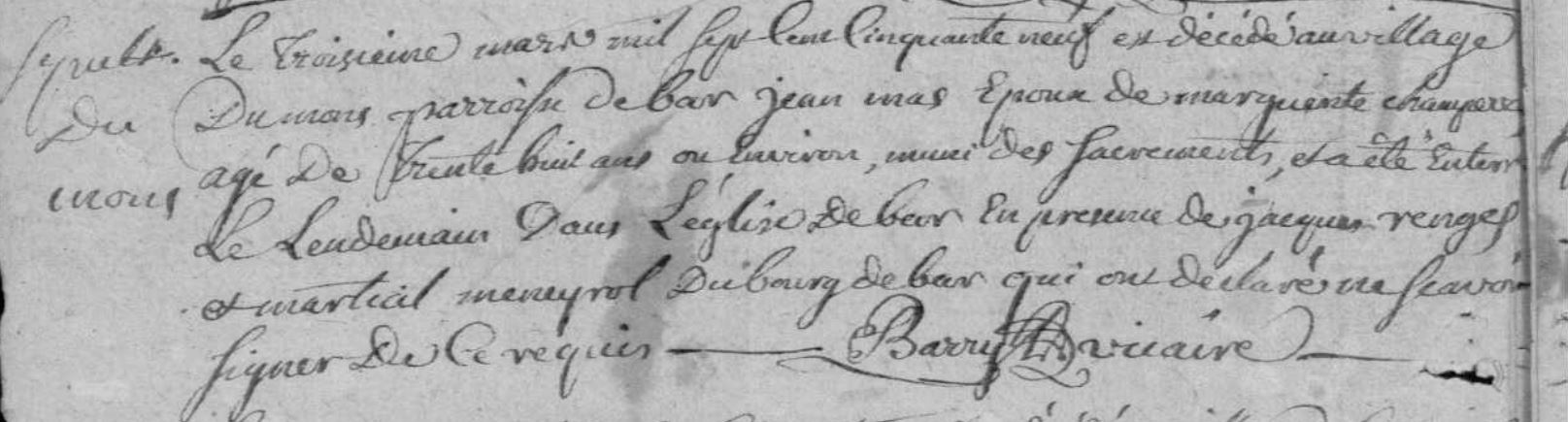 | Prénom | Jean | | Nom de famille | Mas | | Naissance | 18 septembre 1722 | Bar, Corrèze, FRANCE (Le Mons, Bar, 19016, Corrèze, Nouvelle-Aquitaine, France) | | Baptême | 18 septembre 1722 | Bar, Corrèze, FRANCE (, Bar, 19016, Corrèze, Nouvelle-Aquitaine, France) | | Décès | 3 mars 1759 à l'âge de 37 ans | Bar, Corrèze, FRANCE (, Bar, 19016, Corrèze, Nouvelle-Aquitaine, France) |