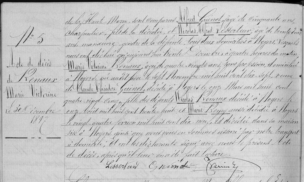 | Prénom | Marie Victorine | | Nom de famille | Renaud | | Naissance | 7 octobre 1817 | Noyers, Haute-Marne, FRANCE (, Noyers, 52358, Haute Marne, Grand-Est, France) | | Décès | 30 décembre 1897 à l'âge de 80 ans | Noyers, Haute-Marne, FRANCE (, Noyers, 52358, Haute Marne, Grand-Est, France) | Témoins Décès | Témoin Alfred Guinot (1848) Témoin Nicolas Alfred Lesserteur (1865)
