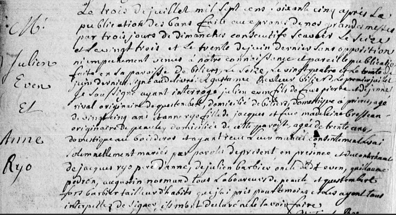 | Union | Julien Even (1739) | le trois de juillet mil sept cens soixante cinq après la publication des bans faits aux prones de nos grandes messes par trois jours de dimanches consecutifs seavoir le seize et le vingt trois et le trente de juin derniers sans opposition ni empechement venus à notre connaissance et pareilles publications faite en la paroisse de Biliers, le seize, le vingt quatre et le trente de juin dernier signé au délivré a .. Recteur Gilier le premier juillet je soussigné ayant interrogé Julien Even fils de feu Pierre et de Jeanne Rival originaire de Questembert domicilié de Biliers, domestique à présent agé de vingt six ans et Anne Ryo fille de Jacques et feue Madeleine Bressean domestique au Boisdemos et ayant recu leur mutuel consentement les ai solennellement mariés par paroles de present en présence et.... de Jacques Ryo père d'Anne, de Julien Barbier, oncle dudit Even, Guillaume Pedron, Augustin Normand tous laboureurs de Peaule et Questembert .... barbier tailleur d'habits que j'ai pris pour témoins et les ayant tous interpelles de signer, ils m'ont déclaré ne le savoir faire | Mariage (plus...) | 3 juillet 1765 à l'âge de 30 ans | Limerzel, Morbihan, FRANCE (, Limerzel, 56220, Morbihan, Bretagne, France) | Enfant(s) | Jacques Even