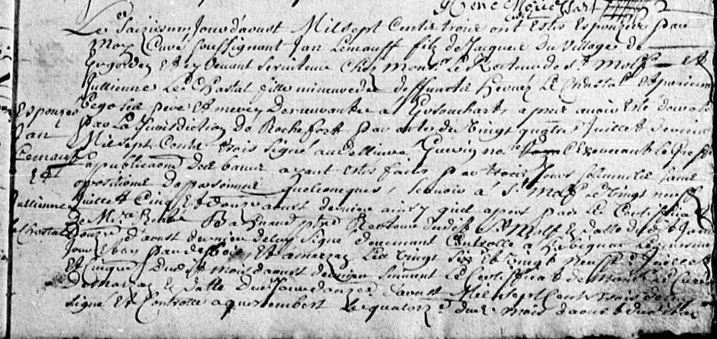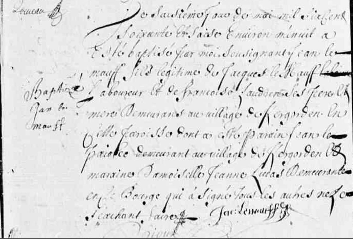 | Prénom | Jean | | Nom de famille | Le Mauff | | Naissance | 16 mai 1676 | Marzan, Morbihan, FRANCE (Kergordenne, Marzan, 56126, Morbihan, Bretagne, France) | | Baptême | 16 mai 1676 | Marzan, Morbihan, FRANCE (, Marzan, 56126, Morbihan, Bretagne, France) |