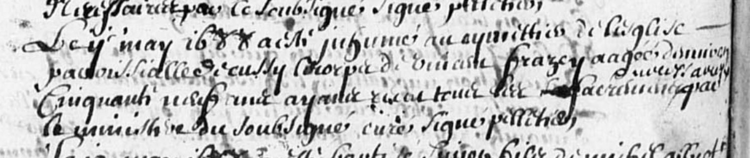 le 11 may 1688 a été inhumé .... de l'église paroissialle de cussy le corps de vincent frazey agé d'environ cinquante neuf ans ayant revu tous les sacrements... ... le .... du soussigné curé signé pelletier?