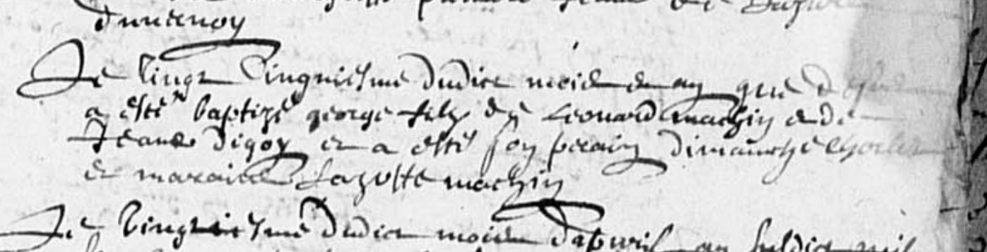 | Prénom | George | | Nom de famille | Machin | | Profession | Couvreur en paille | | Naissance | 25 avril 1639 | Cussy-en-Morvan, Saône-et-Loire, FRANCE (, Cussy-en-Morvan, 71165, Saône et Loire, Bourgogne-Franche-Comté, France) | | Baptême | 25 avril 1639 | Cussy-en-Morvan, Saône-et-Loire, FRANCE (, Cussy-en-Morvan, 71165, Saône et Loire, Bourgogne-Franche-Comté, France) | | Décès | 23 juillet 1677 à l'âge de 38 ans | Cussy-en-Morvan, Saône-et-Loire, FRANCE (, Cussy-en-Morvan, 71165, Saône et Loire, Bourgogne-Franche-Comté, France) |