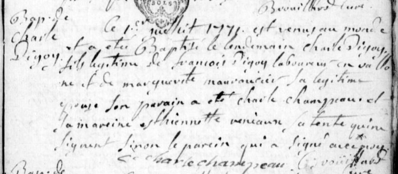 | Prénom | Charle | | Nom de famille | Digoy | | Naissance | 1 juillet 1771 | Sommant, Saône-et-Loire, FRANCE (, Sommant, 71527, Saône et Loire, Bourgogne-Franche-Comté, France) | | Baptême | 1 juillet 1771 | Sommant, Saône-et-Loire, FRANCE (, Sommant, 71527, Saône et Loire, Bourgogne-Franche-Comté, France) |