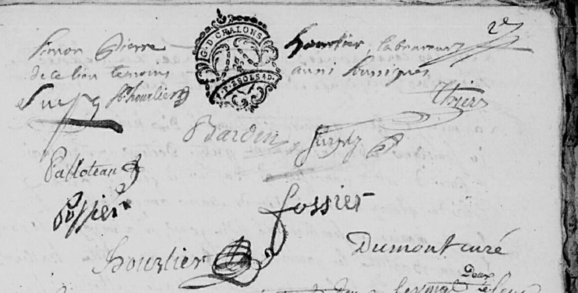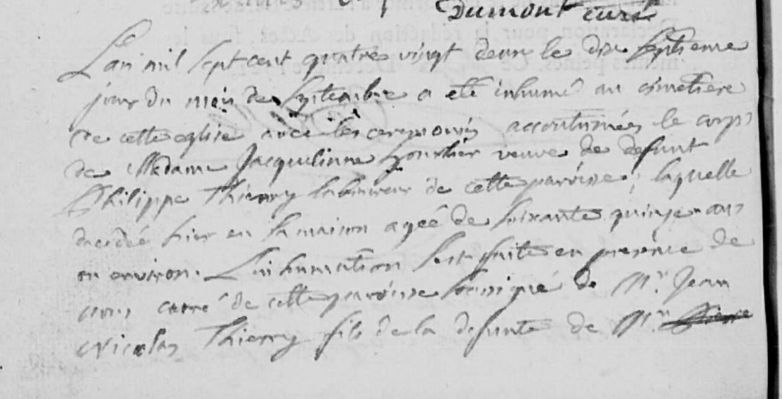 L'an mil sept cent quatre vingt deux septieme jour du mois de septembre a été inhumé au cimetiere de cette église avec les .... accoutumés le corps de madame Jacqueline Hourlier veuve de défunt Philippe Thierry habitant en cette paroisse, laquelle decedée hier en sa maison agée de soixante quinze ans ou environ. L'inhumation s'est faite en présence de ... carré de cette paroisse de M. Jean Nicolas Thierry fils de la défunte de Mr Simon Pierre Hourlier laboureur de ce ... témoins aussi soussigné ...