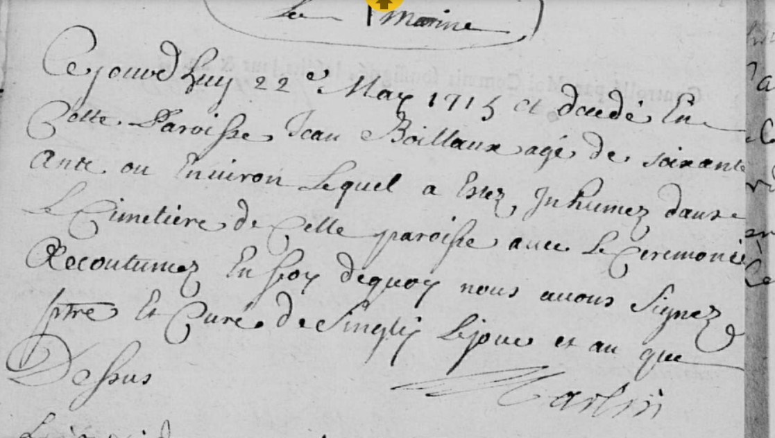 ce jourd'huy 22e may 1713 est décédé en cette paroisse Jean Boillaux âgé de soixante ans ou environ lequel a esté inhumé dans le cimetiere de cette paroisse avec les cérémonies accoutumées en foy de quoy nous avons signé pretre et curé de ... le jour et an que