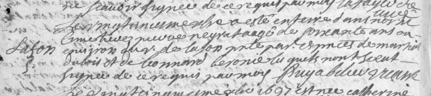 | Prénom | Pierre | | Nom de famille | Neyrac | le 21eme jour du moys d'avril 1636 a este baptisé Pierre Neyrac fils légitime ... d'Antoine Neyrac et Charlotte Serres du village de Lafon, parain Pierre Neyrac ...de Broussac paroise de Corrèze, marraine ... Lafon | Naissance (plus...) | 21 avril 1636 | Bar, Corrèze, FRANCE (Lafont, Bar, 19016, Corrèze, Nouvelle-Aquitaine, France) | | Baptême | 21 avril 1636 | Bar, Corrèze, FRANCE (, Bar, 19016, Corrèze, Nouvelle-Aquitaine, France) | le vingt unieme xbre a esté enterré dans notre cimetiere Pierre Neyrac agé de soixante ans ou environ ... de Lafon .... par en prnces de Martial Dubois et de Léonard Legonie lesquels n'ont su signer de ce requis par moy | Décès (plus...) | 21 décembre 1697 à l'âge de 61 ans | Bar, Corrèze, FRANCE (, Bar, 19016, Corrèze, Nouvelle-Aquitaine, France) | | Sépulture | 21 décembre 1697 | Bar, Corrèze, FRANCE (, Bar, 19016, Corrèze, Nouvelle-Aquitaine, France) |