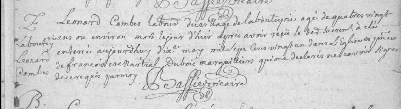 | Prénom | Léonard | | Nom de famille | Combes | | Naissance | 1635 | | Léonard Combes labour du village de la Bouteyrie âgé de quatre vingt ans ou environ mort le jour d'hier après avoir reçu le ... sacrement a été enterré aujourd'huy dix may mil sept cens vingt et un dans l'église en présence de François et Martial Dubois marguillés qui ont déclarés ne savoir signer de ce requis par moy | Décès (plus...) | 9 mai 1721 à l'âge de 86 ans | Bar, Corrèze, FRANCE (, Bar, 19016, Corrèze, Nouvelle-Aquitaine, France) |